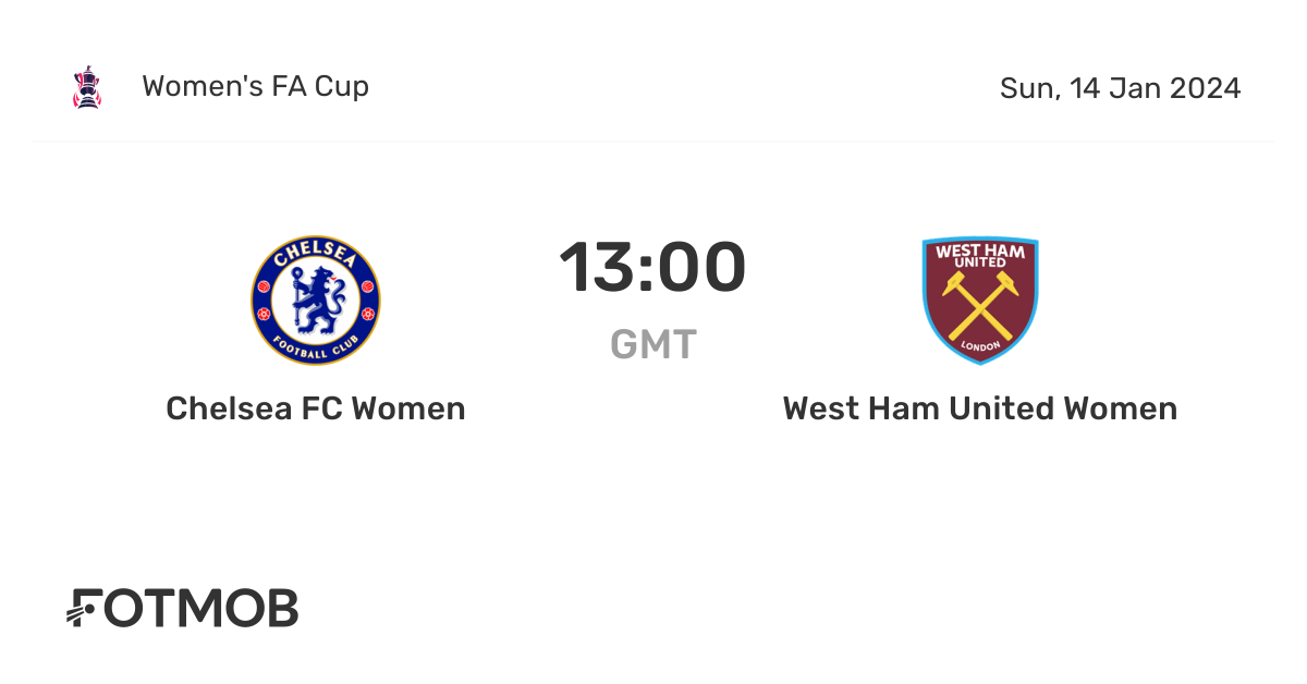 About the match. West Ham Women is going head to head with Chelsea FC Women starting on 24 Mar 2024 at 16:30 UTC . The match is a part of the The FA Women's Super League. West Ham Women played against Chelsea FC Women in 2 matches this season. Currently, West Ham Women rank 11th, while Chelsea FC Women hold 2nd position.