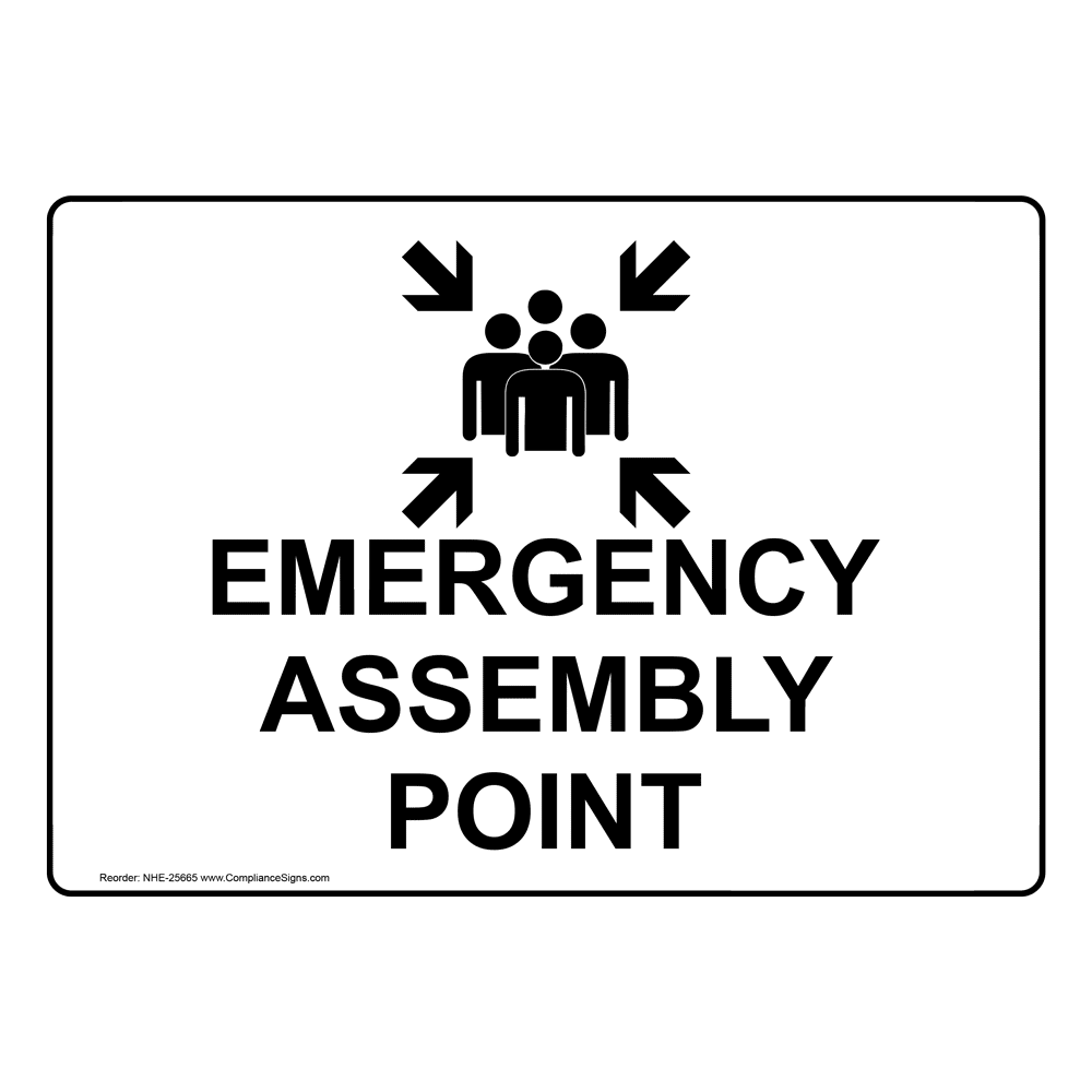 Details. This Emergency Assembly Point Sign uses safety messages for emergency response protocol and compliance. An Emergency Assembly Point Sign is a useful tool to help protect the health and safety of personnel, but is not a substitute for required protective measures for eliminating or reducing hazards.