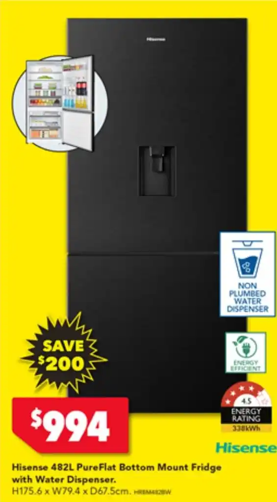 Hisense 482L PureFlat Bottom Mount Fridge with Water Dispenser. offer at Harvey Norman