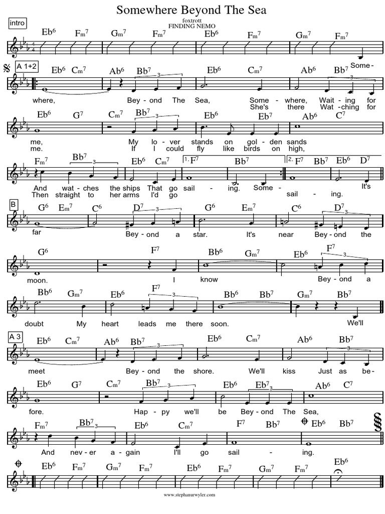 Somewhere beyond the sea She's there watching for me If I could fly like birds on high Then straight to her arms I'd go sailing It's far beyond the stars It's near beyond the moon I know beyond a doubt My heart will lead me there soon We'll meet beyond the shore We'll kiss just as before Happy we'll be beyond the sea And never again I'll go sailing